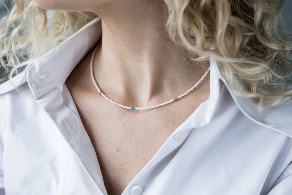 This piece of jewelry is made of Nigerian white zircon and five colored cut stones. The zircon is faceted, semi-translucent. Zircon width: 2 - 2.3 mm. The colored stones are red tourmaline from Malawi, yellow sapphire from India, pink ruby from Mozambique, green emerald from Colombia and neon apatite from Brazil. Width of colored stones: 3 - 3.5 mm.
