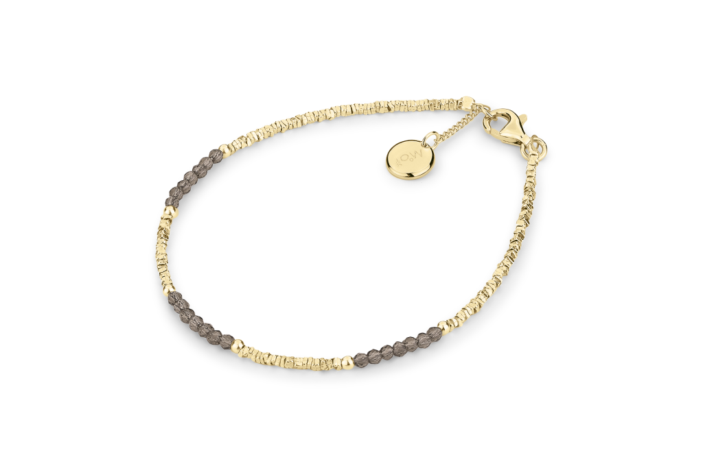 Tento náramek je vyroben z jemných částic pozlaceného sterlingového stříbra a křemene pocházejícího z Brazílie. Křemen je drobně fasetovaný, polotransparentní. Barva kamene je hnědá s jemným šedým nádechem. Mohsova stupnice tvrdosti: 7.