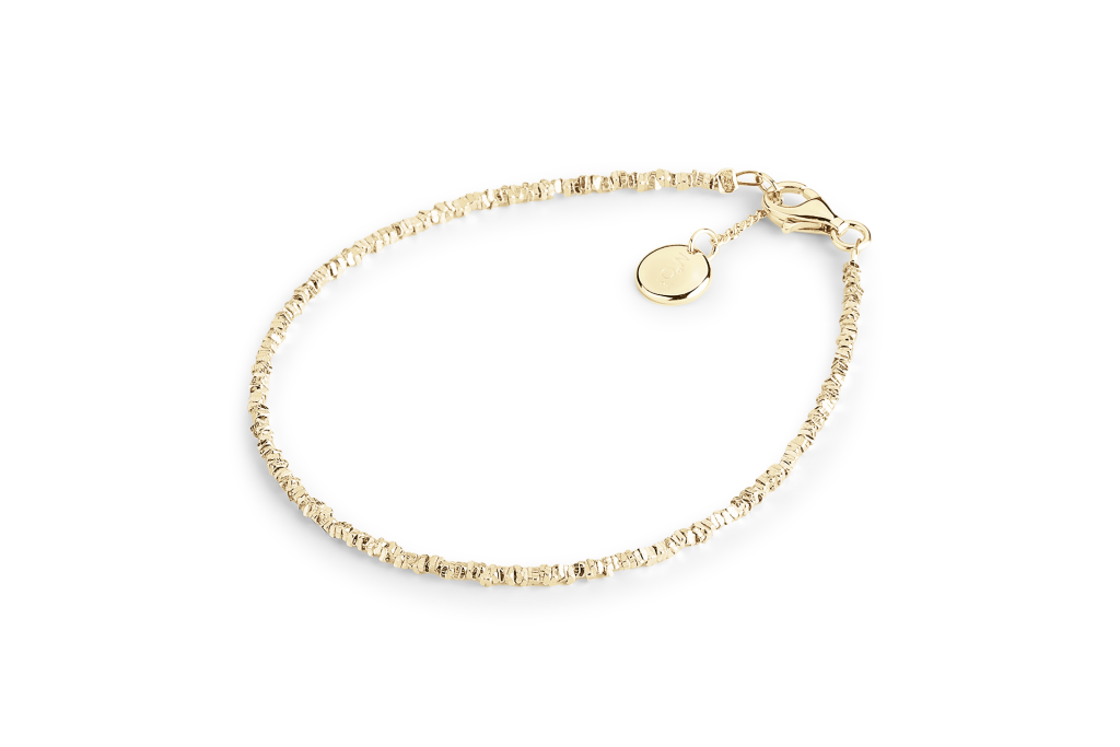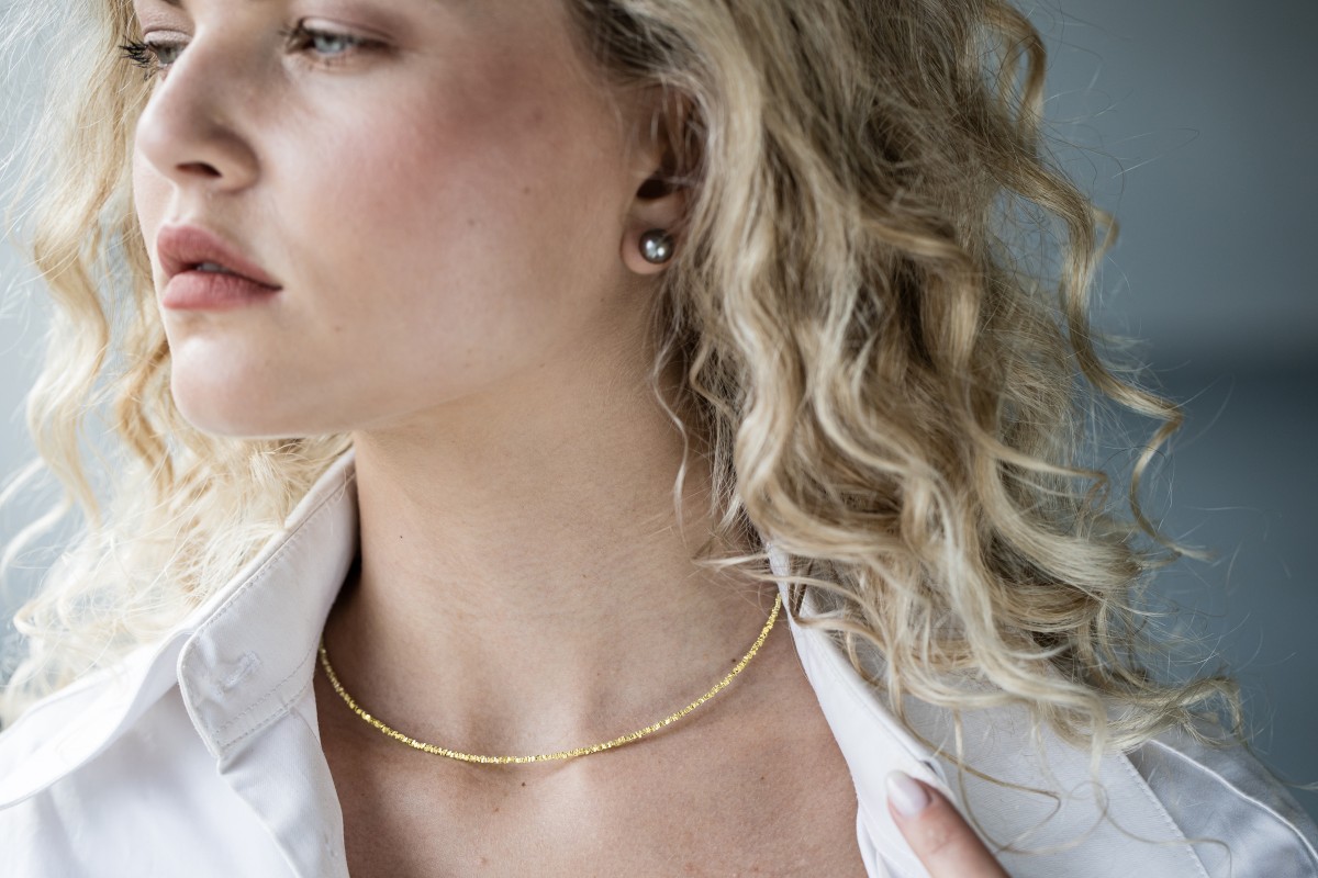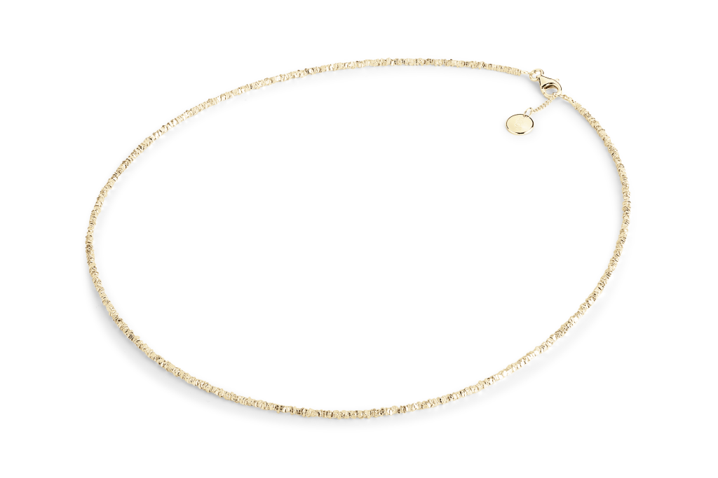 Tento náhrdelník je vyroben z jemných částic pozlaceného sterlingového stříbra, které jsou navlečeny na nylonovém lanku.