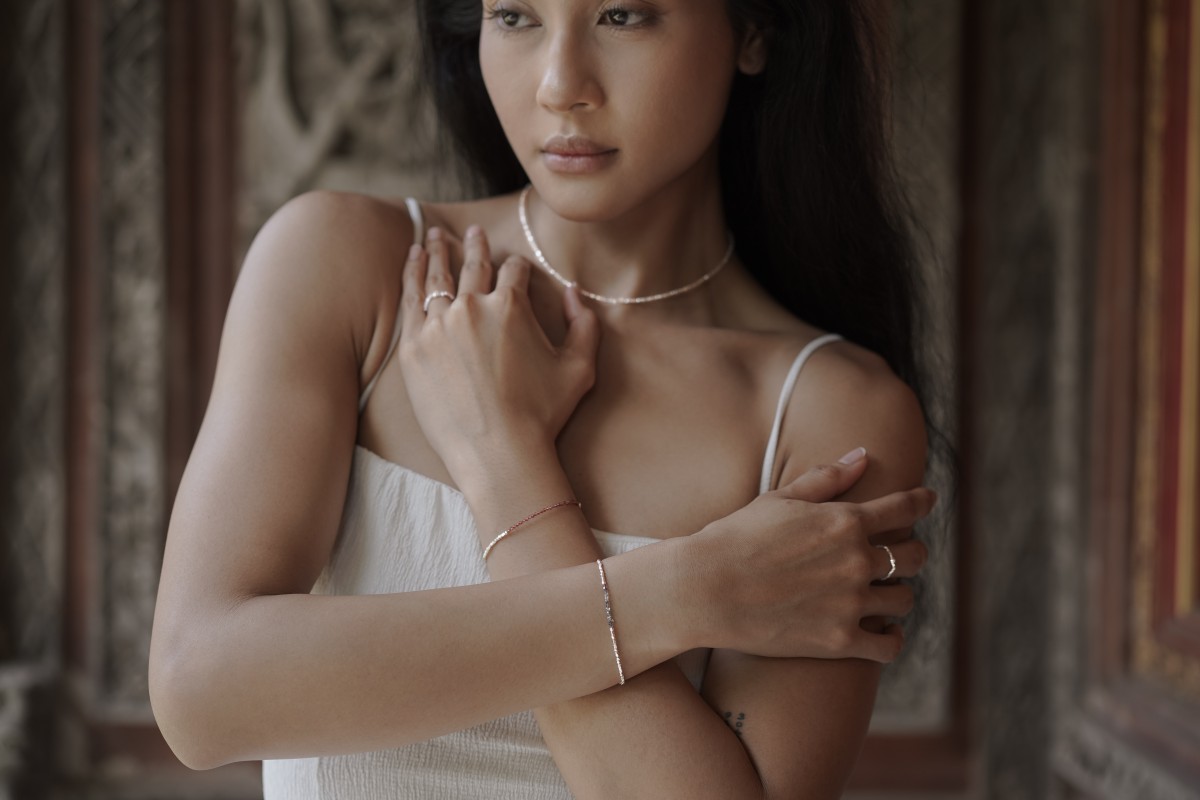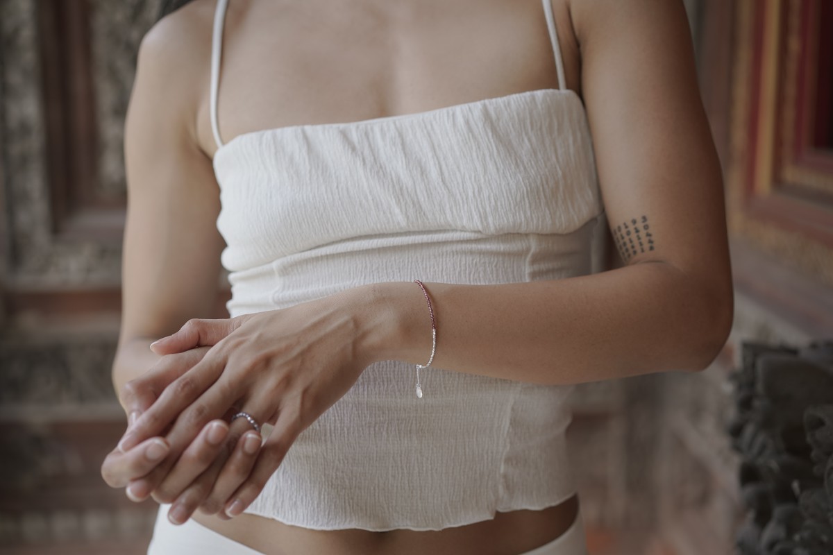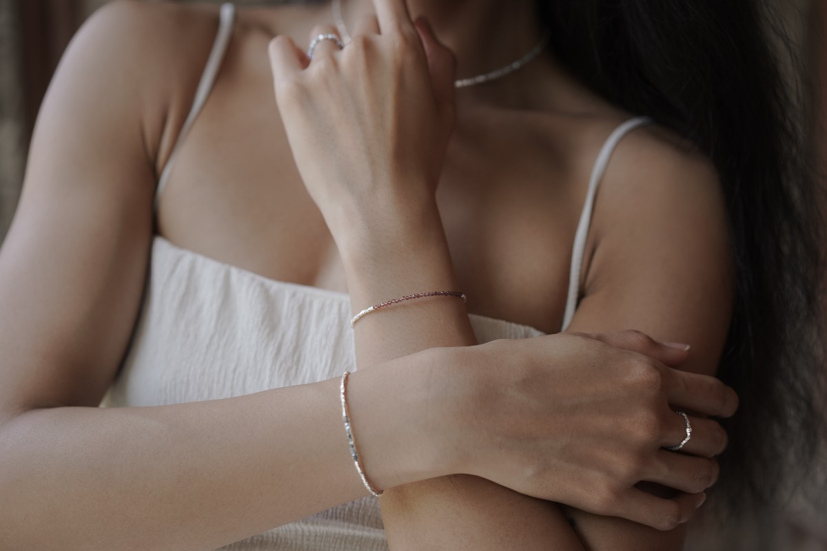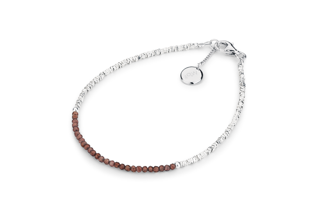 Tento náramek je vyroben z jemných částic sterlingového stříbra a granátu pocházejícího z Indie. Granát je drobně fasetovaný, polotransparentní. Barva kamene je tmavě červená. Mohsova stupnice tvrdosti: 7.
