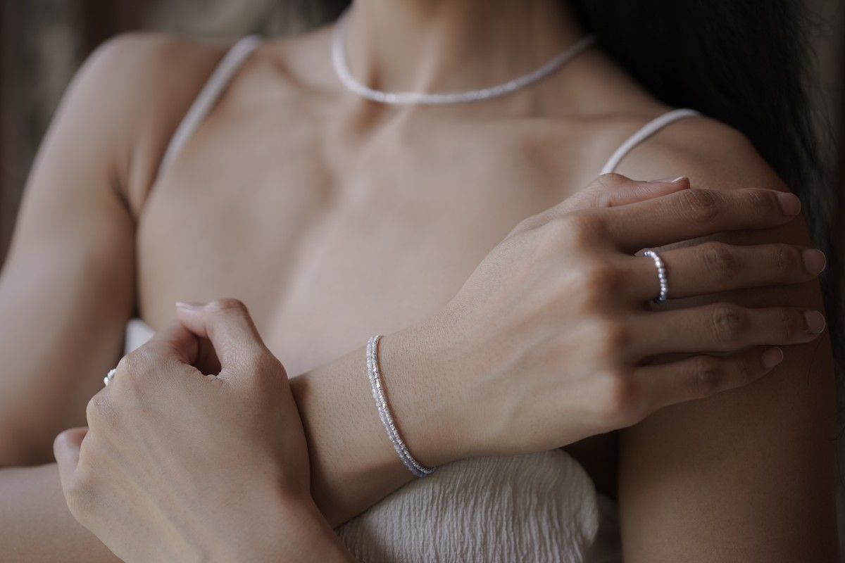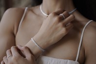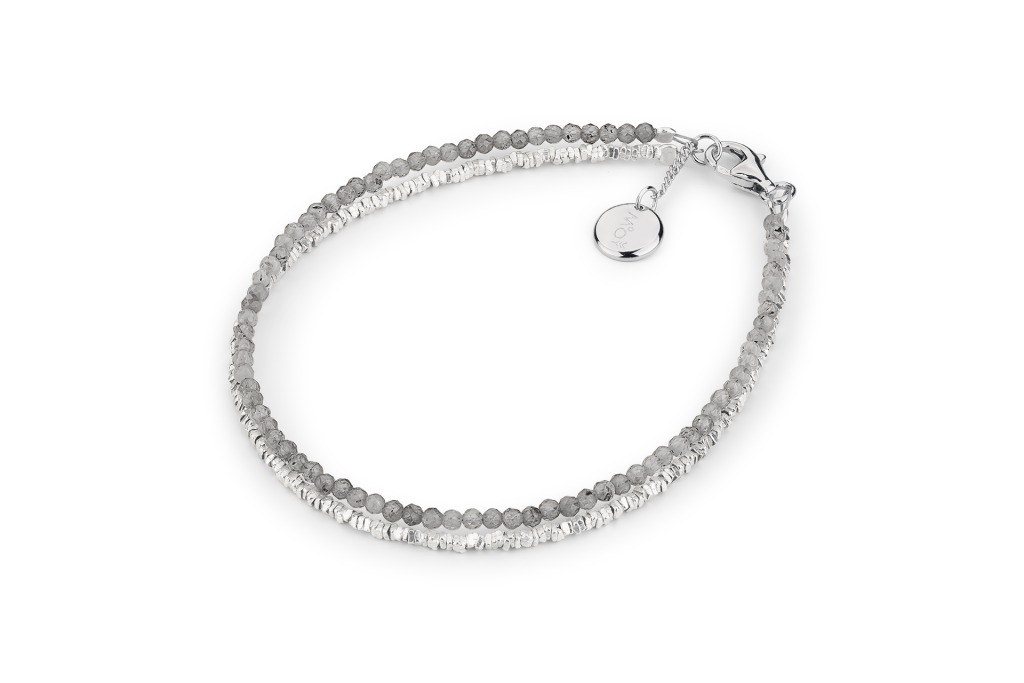Tento náramek je vyroben z jemných částic sterlingového stříbra a jihoafrického zirkonu šedé barvy. Zirkon je fasetovaný, průsvitný se zářivými odlesky. Šířka zirkonu: 2 mm. Mohsova stupnice tvrdosti: 7,5.