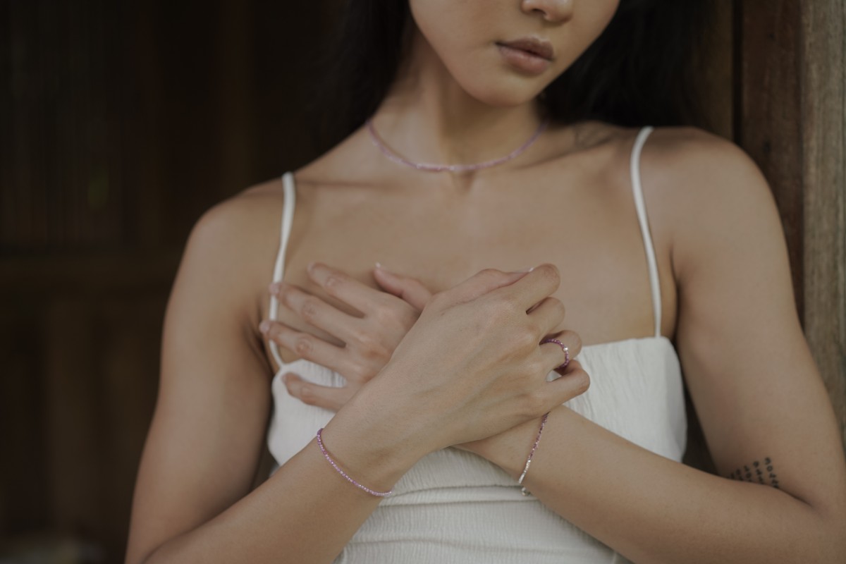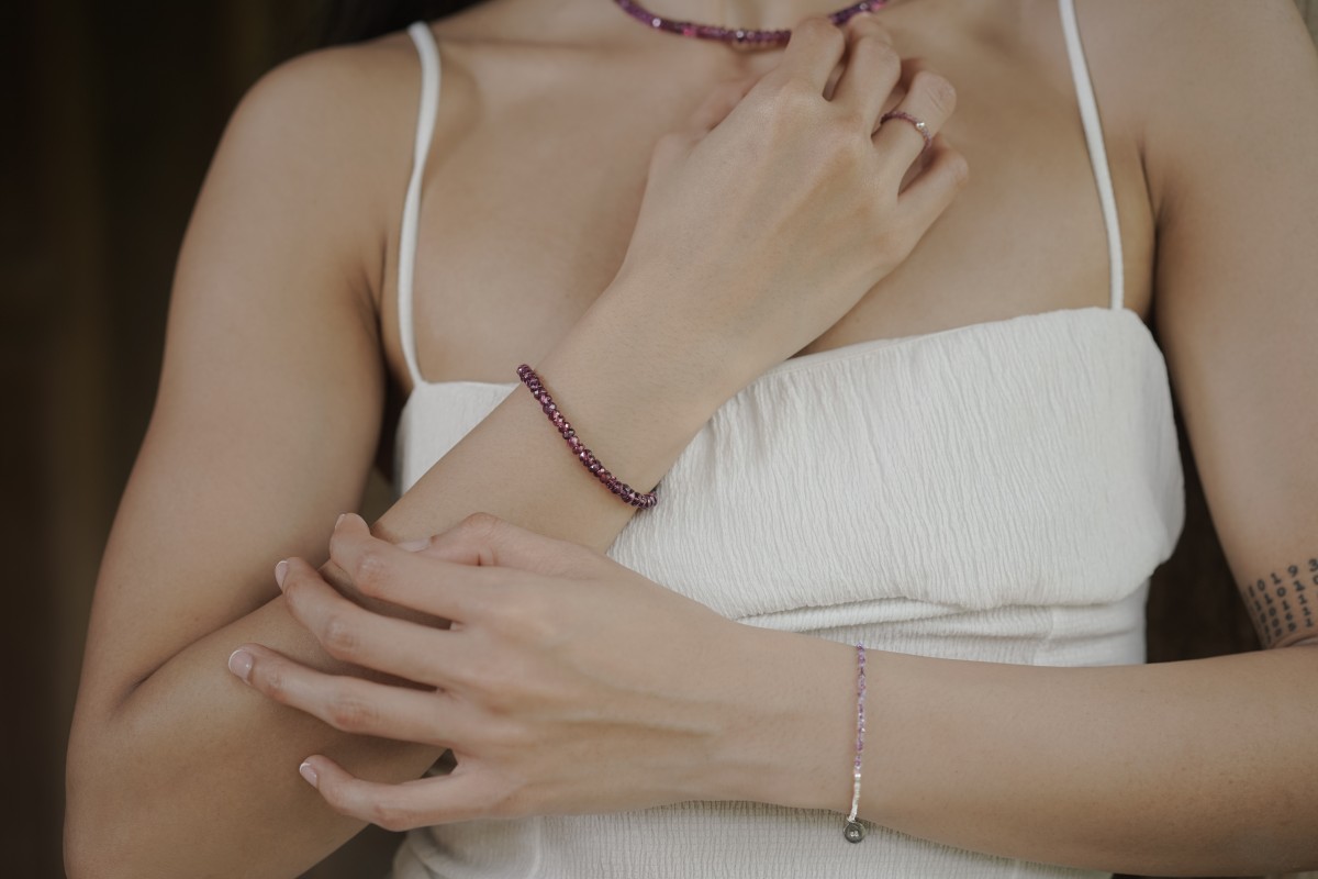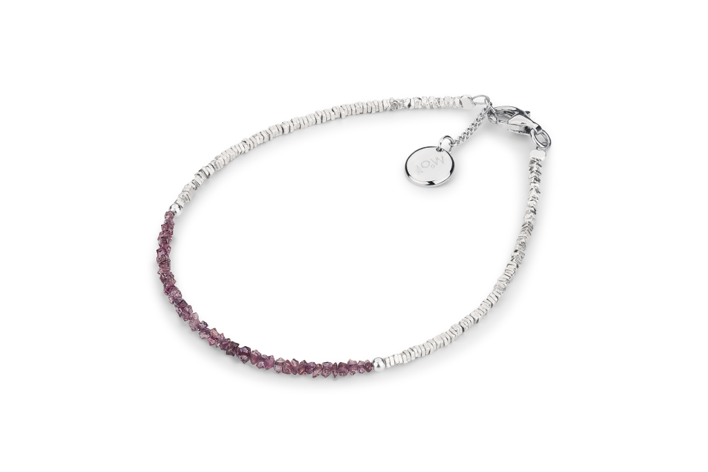 Tento náramek je vyroben z jemných částic sterlingového stříbra a křemene pocházejícího z Brazílie. Křemen je barvený, nepravidelný, polotransparentní. Barva kamene je červená s vínovým až bordó odstínem. Mohsova stupnice tvrdosti: 7.